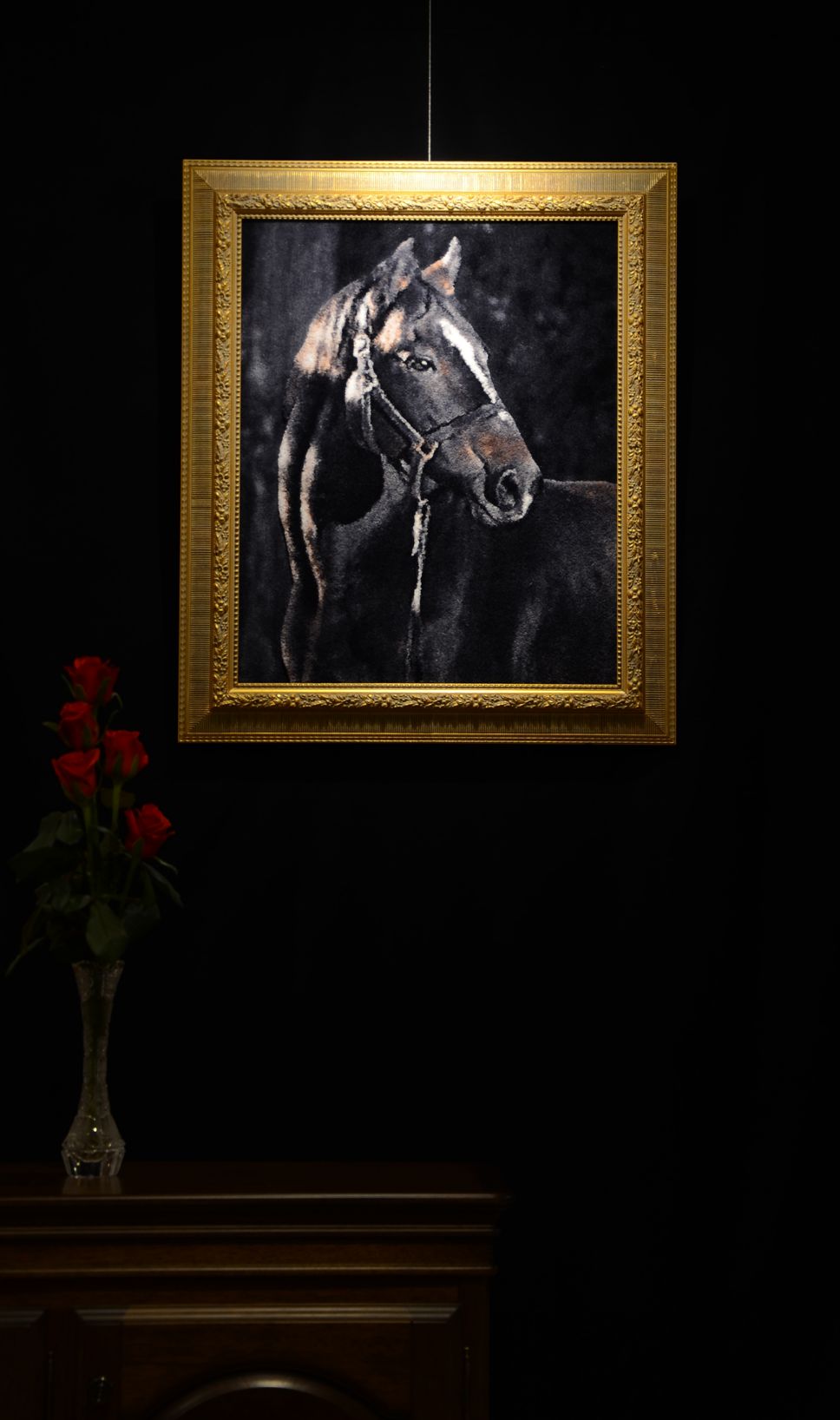 その記念すべき第一作としてのウオッカタペストリーは、絵画でも写真でもないタペストリー独特の趣が最大限に表現され、その存在感は重厚感ある落ち着きを持たらしています。